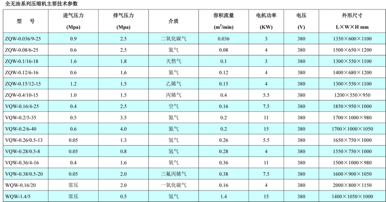 全無(wú)油系列壓縮機(jī)為往復(fù)活塞式。該系列壓縮機(jī)為公司自行研制生產(chǎn)的產(chǎn)品。該系列產(chǎn)品具有結(jié)構(gòu)緊湊、振動(dòng)小、噪音低、運(yùn)行平穩(wěn)、使用方便、安全可靠等特點(diǎn)。由于該系列產(chǎn)品為全無(wú)油潤(rùn)滑,從而保證壓縮機(jī)輸送出去的氣體不含油。全無(wú)油系列壓縮機(jī)已使用于氮?dú)狻錃?、天然氣、三氟丙烯氣等氣體的增壓和輸送。